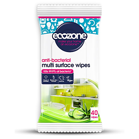 Ecozone Anti Bacterial Wipes (40 wipes) is part of the range of Ecozone natural household cleaning products. Keep every room in your home germ-free and looking its best the naturally with Ecover antibacterial cleaning products and kitchen cleaning solutions in spray, tablet or stick form! Shop the full range of popular Ecozone products, including Ecozone microfibre cleaning cloths and Ecozone speciality products, available from Big Green Smile.